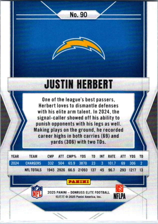 This is a nice example of a 2025 Donruss Elite #90 Justin Herbert