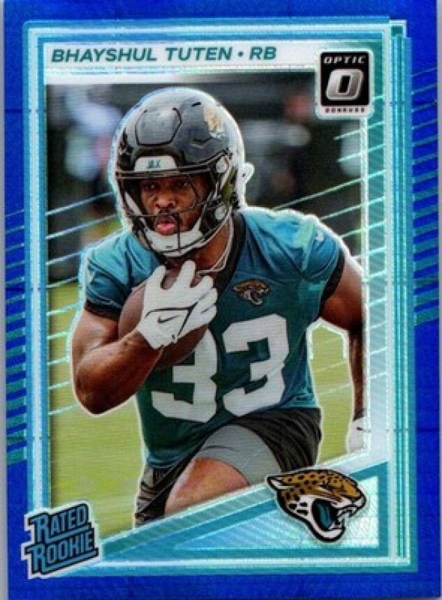 This is a nice example of a 2025 Donruss Optic #272 Bhayshul Tuten Blue Hyper