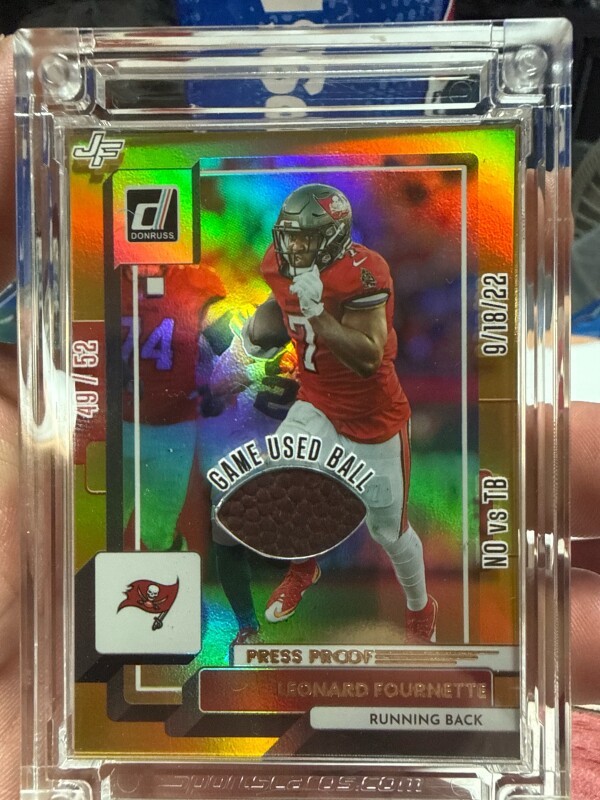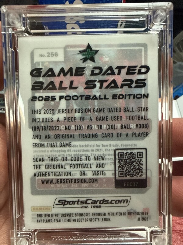 This is a game used ball patch from 09/18/22 Saints vs Buccaneers. On the back of the card is a QR code. That will show you the ball and authentication