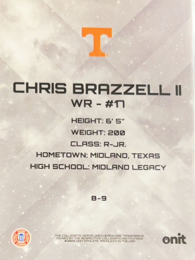 You are purchasing a 2025 Onit Tennessee Volunteers Football Chris Brazzell II #B-9. You will receive the exact item in the photographs. Thank you for looking.