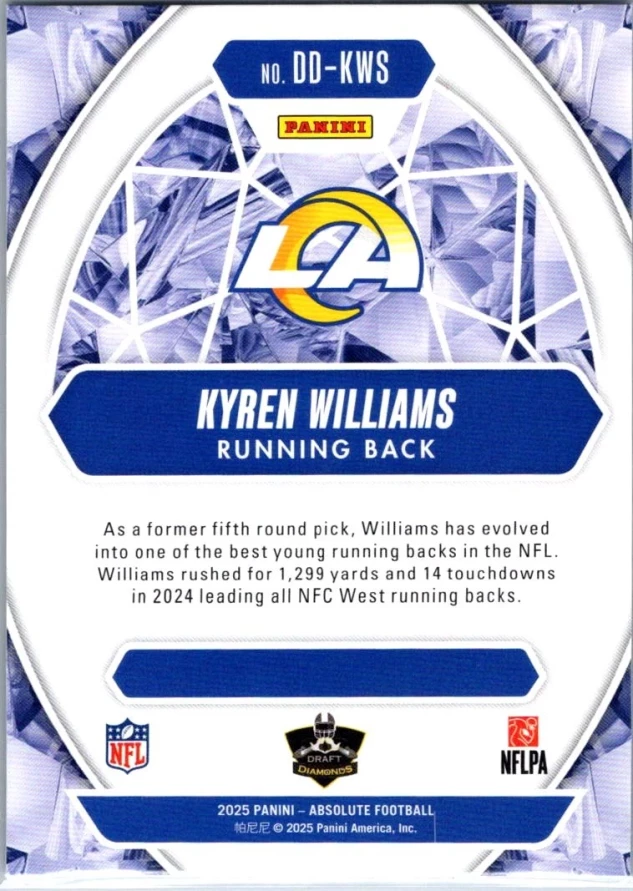 This is a nice example of a 2025 Panini Absolute #DD-KWS Kyren Williams Draft Diamonds