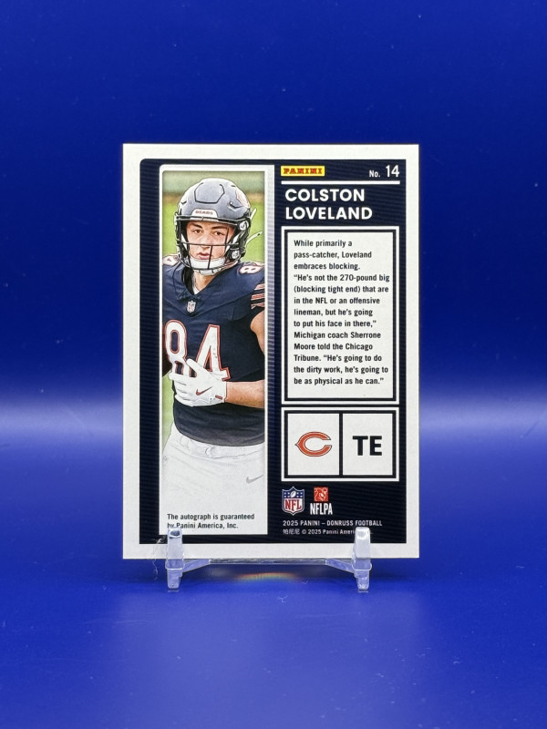 Don’t miss out on this must-have 2025 Panini Donruss The Rookies Colston Loveland autographed card, featuring the exciting Chicago Bears rookie! This rare card is serial numbered out of just 299 and showcases a bold signature from Colston Loveland, making it a standout addition for any NFL or football card collector. Secure this highly sought-after collectible today and celebrate the future of the Bears!