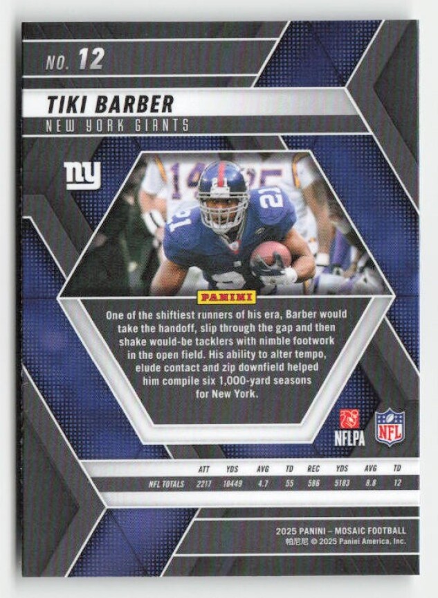 You are purchasing a 2025 Panini Mosaic Tiki Barber #12. You will receive the exact item in the photographs. Thank you for looking.