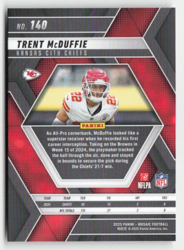You are purchasing a 2025 Panini Mosaic Trent McDuffie #140. You will receive the exact item in the photographs. Thank you for looking.