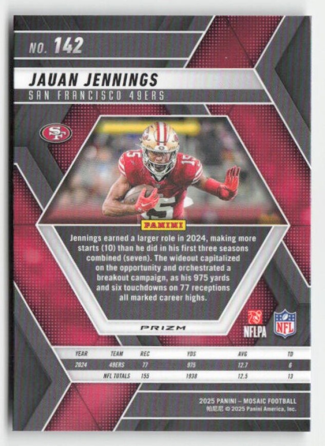 You are purchasing a 2025 Panini Mosaic Jauan Jennings #142 Mosaic Camo Pink. You will receive the exact item in the photographs. Thank you for looking.