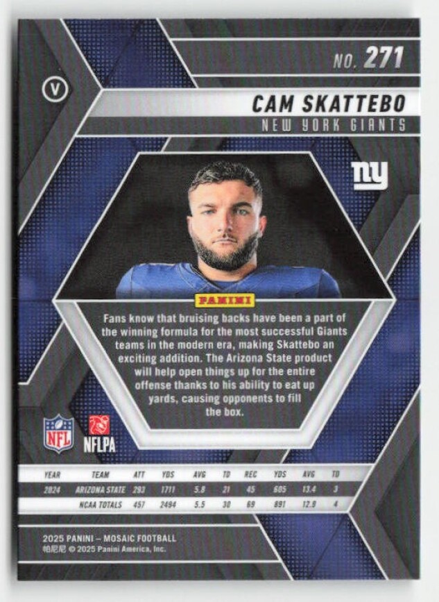 You are purchasing a 2025 Panini Mosaic Cam Skattebo #271 RC. You will receive the exact item in the photographs. Thank you for looking.