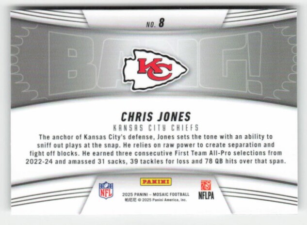 You are purchasing a 2025 Panini Mosaic Chris Jones #8 Bang!. You will receive the exact item in the photographs. Thank you for looking.