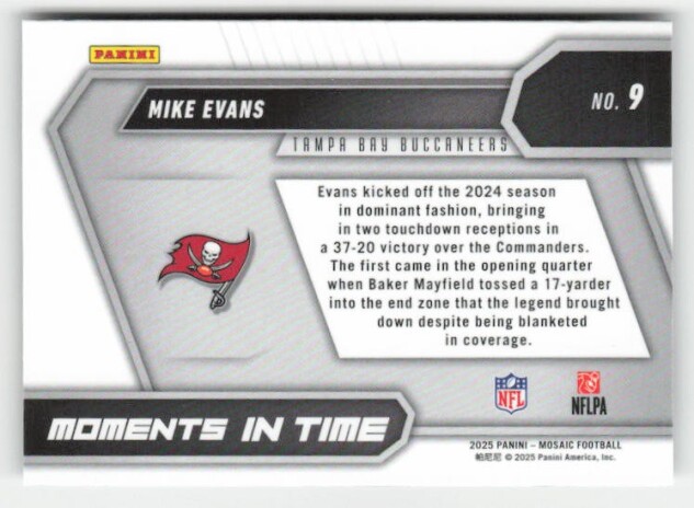 You are purchasing a 2025 Panini Mosaic Mike Evans #9 Moments In Time Mosaic. You will receive the exact item in the photographs. Thank you for looking.