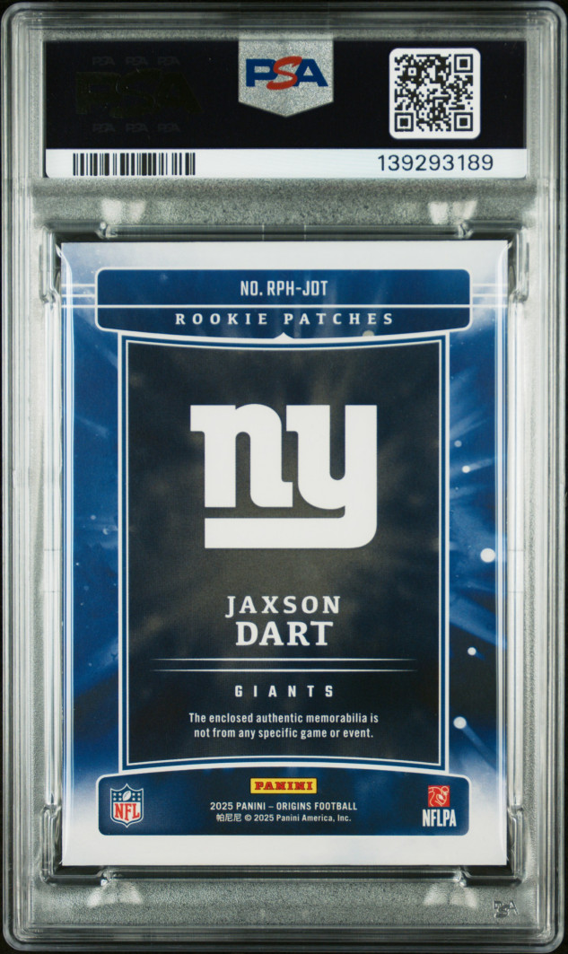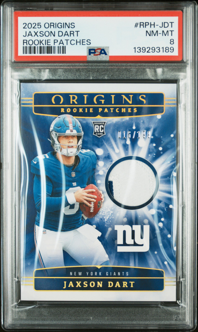 The 2025 Panini Origins Rookie Patch card of Jaxson Dart from the New York Giants is a highly sought-after sports trading card. Featuring a graded 8 from Professional Sports Authenticator (PSA), this card is part of a limited edition set of 199 and is a valuable collectible for football fans. Panini, a trusted manufacturer in the sports trading card industry, ensures the authenticity and quality of this rookie card, making it a desirable addition to any sports memorabilia collection