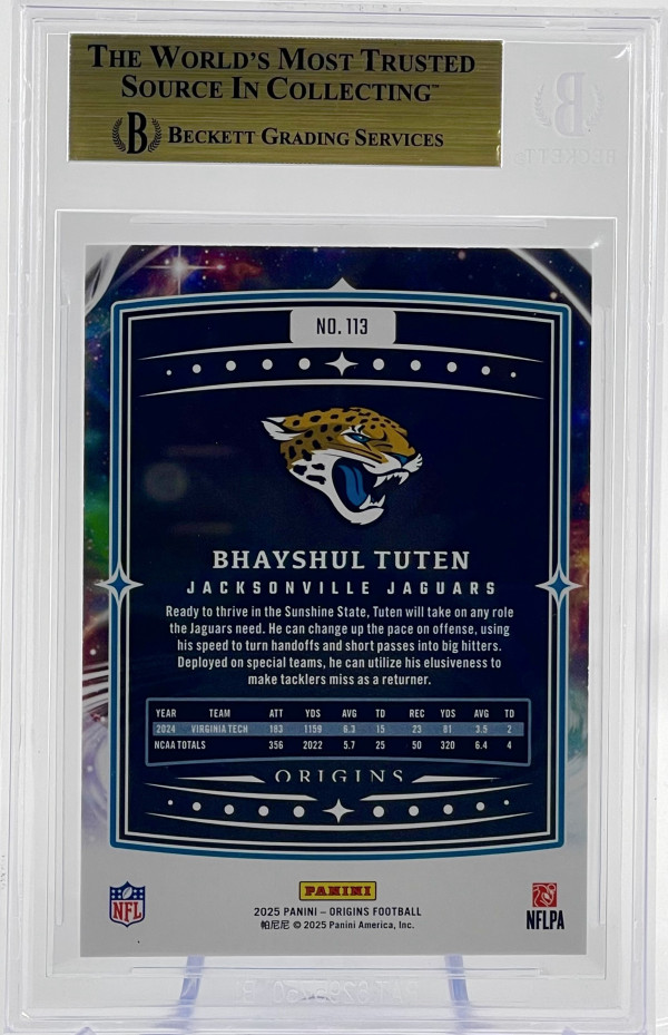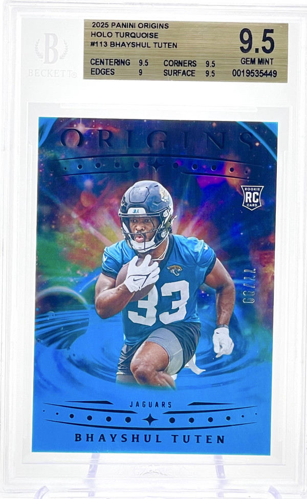 The 2025 Panini Origins - Rookies Bhayshul Tuten #113 Blue /99 (RC) trading card is a highly sought-after collectible featuring rookie player Bhayshul Tuten from the Jacksonville Jaguars. This graded card has a limited print run of just 99 copies, making it a rare and valuable addition to any football card collection. With a grade of 9.5 from Beckett Grading Services, this card is in top condition and sure to be a prized possession for any NFL fan or card collector.