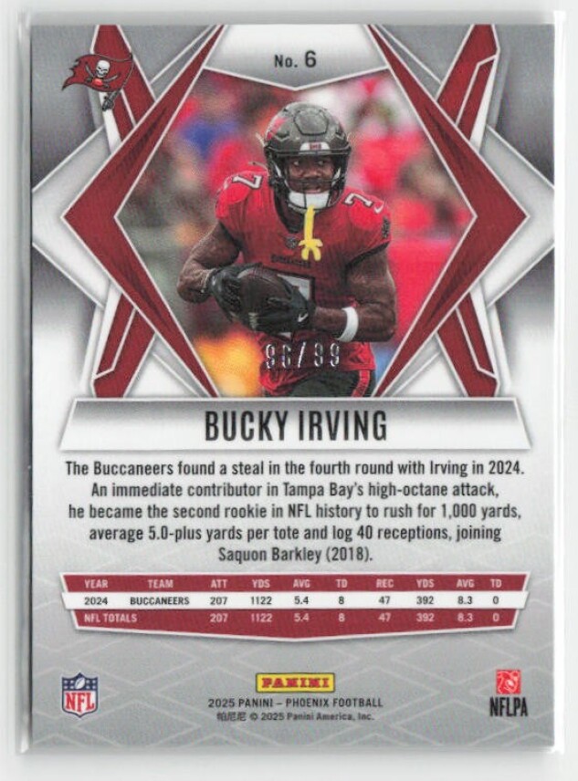 You are purchasing a 2025 Panini Phoenix Bucky Irving #6 Red Prizm SN 96/99. You will receive the exact item in the photographs. Thank you for looking.