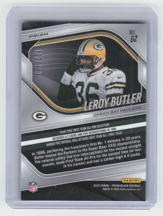 You are purchasing a 2025 Panini Prizm Black LeRoy Butler #62 Prizms Blue SN 127/199. You will receive the exact item in the photographs. Thank you for looking.