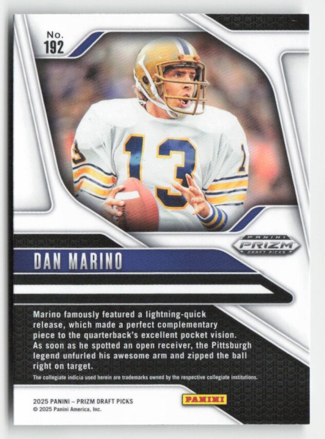 You are purchasing a 2025 Panini Prizm Draft Picks Dan Marino #192. You will receive the exact item in the photographs. Thank you for looking.