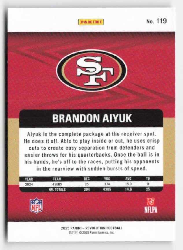 You are purchasing a 2025 Panini Revolution Brandon Aiyuk #119. You will receive the exact item in the photographs. Thank you for looking.