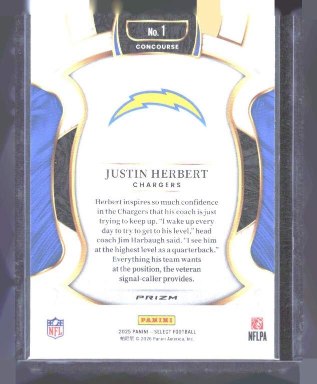 You are purchasing a 2025 Panini Select Justin Herbert #1 Silver Prizm. You will receive the exact item in the photographs. Thank you for looking.