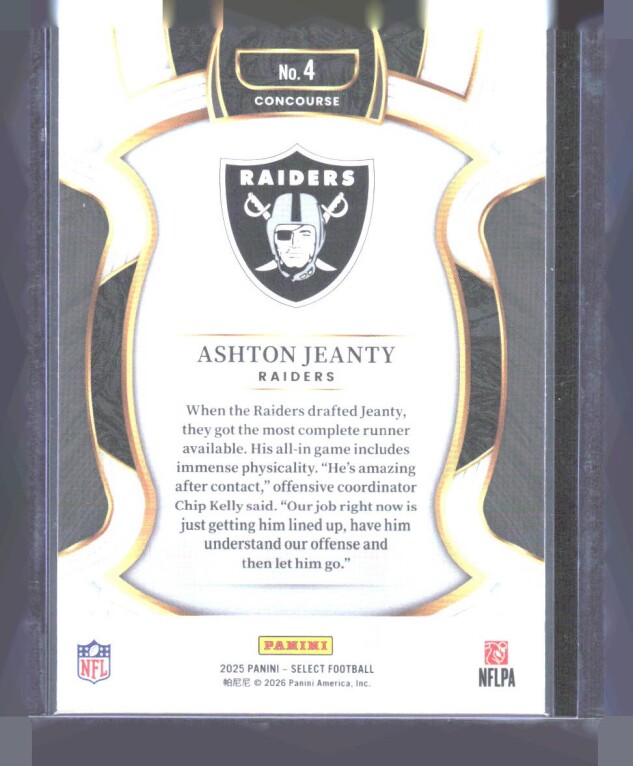 You are purchasing a 2025 Panini Select Ashton Jeanty #4 RC. You will receive the exact item in the photographs. Thank you for looking.