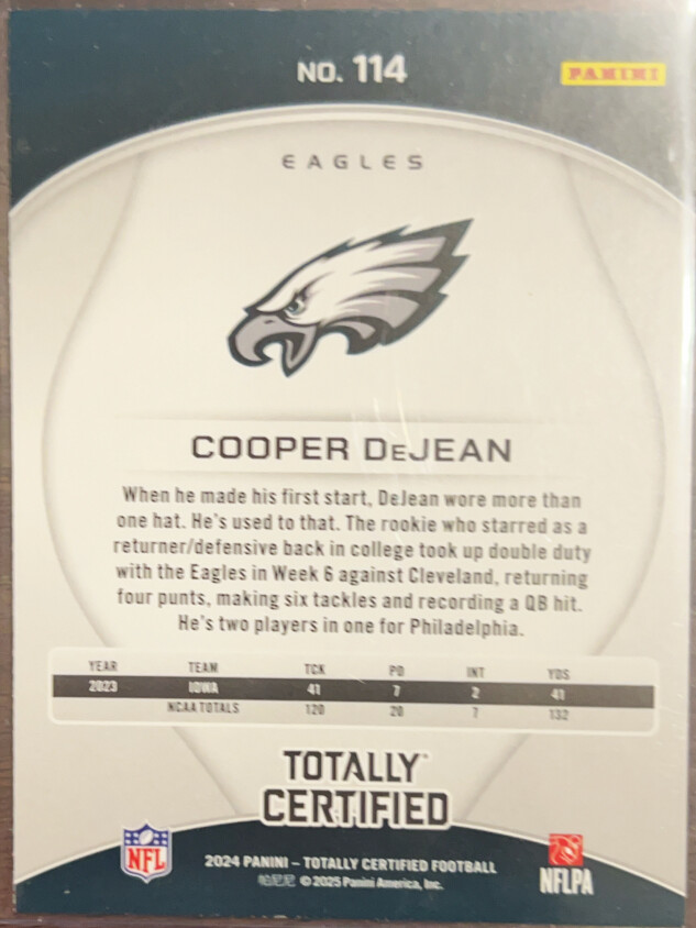 You are purchasing a 2025 Panini Totally Certified Cooper DeJean #114 RC. You will receive the exact item in the photographs. Thank you for looking.