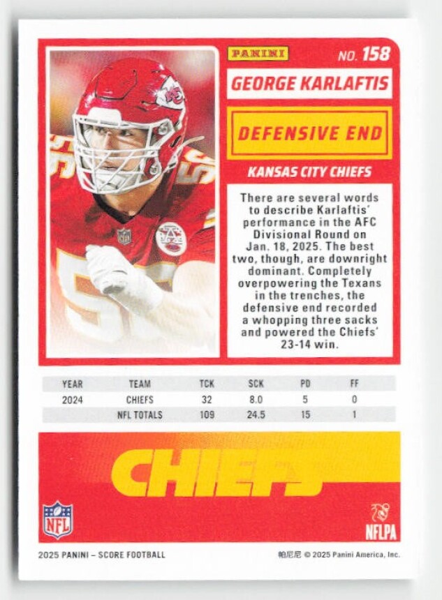 You are purchasing a 2025 Score George Karlaftis #158. You will receive the exact item in the photographs. Thank you for looking.