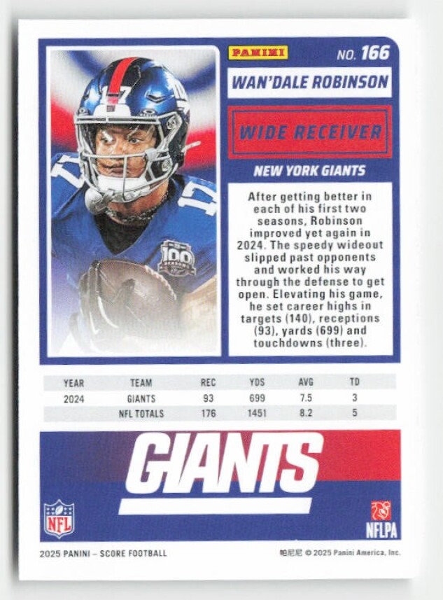 You are purchasing a 2025 Score Wan'Dale Robinson #166. You will receive the exact item in the photographs. Thank you for looking.