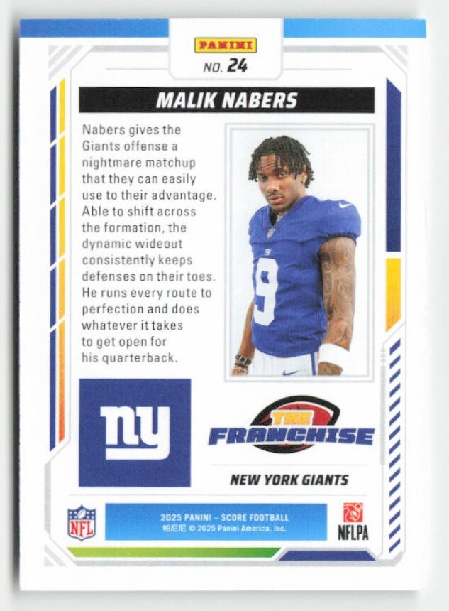 You are purchasing a 2025 Score Malik Nabers #24 The Franchise. You will receive the exact item in the photographs. Thank you for looking.