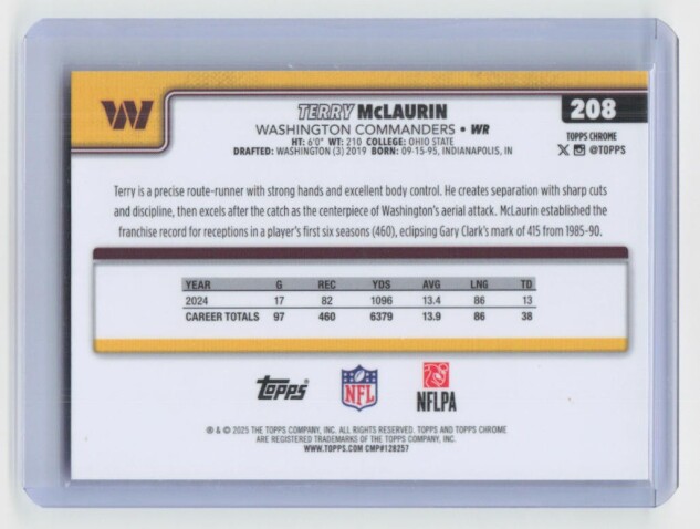 You are purchasing a 2025 TOPPS CHROME TERRY MCLAURIN #208. You will receive the exact item in the photographs. Thank you for looking.