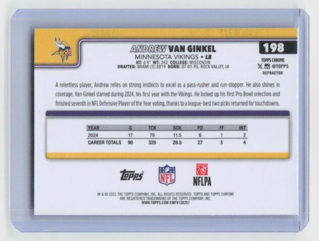 You are purchasing a 2025 TOPPS CHROME ANDREW VAN GINKEL. You will receive the exact item in the photographs. Thank you for looking.