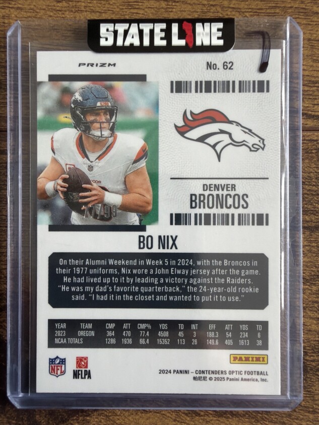 This Blue Rookie Ticket Bo Nix from 2024 Panini Conterders Optic Football is awesome! It is 77/99 made and in amazing shape!