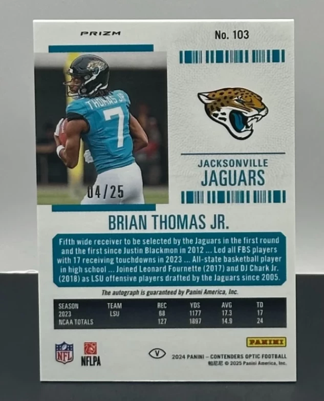 Don't miss your chance to own this rare 2024 Panini Contenders Optic Football Rookie Ticket Auto, featuring an authentic on-card autograph from Brian Thomas Jr. This highly sought-after card is serial numbered 04/25, making it a must-have for serious NFL and Jacksonville Jaguars collectors. With Rookie status and excellent condition, this card stands out as a true gem in any football card collection!