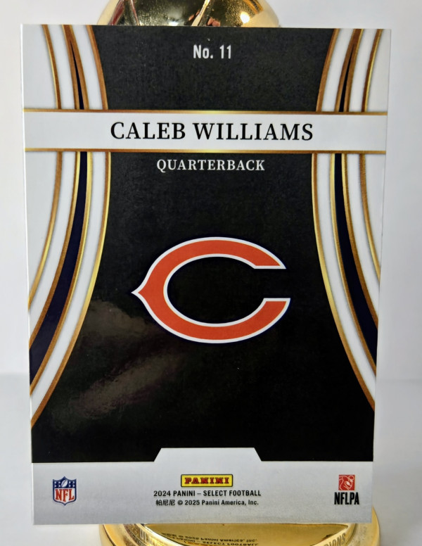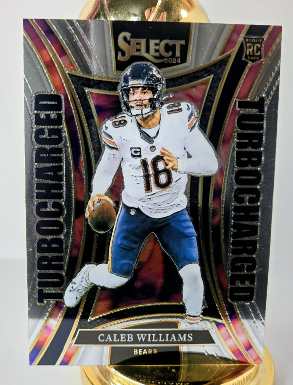 The product is a 2024 Panini Select Turbocharged trading card featuring Caleb Williams, a rookie player for the Chicago Bears in the National Football League (NFL). This card is part of the Turbocharged insert set, known for its high-performing players. As a sports memorabilia collector's item, it showcases the player in his rookie year, making it a valuable addition to any football card collection. The card is a base variety with a specific card number and belongs to the Panini manufacturer's set, appealing to fans of football trading cards.