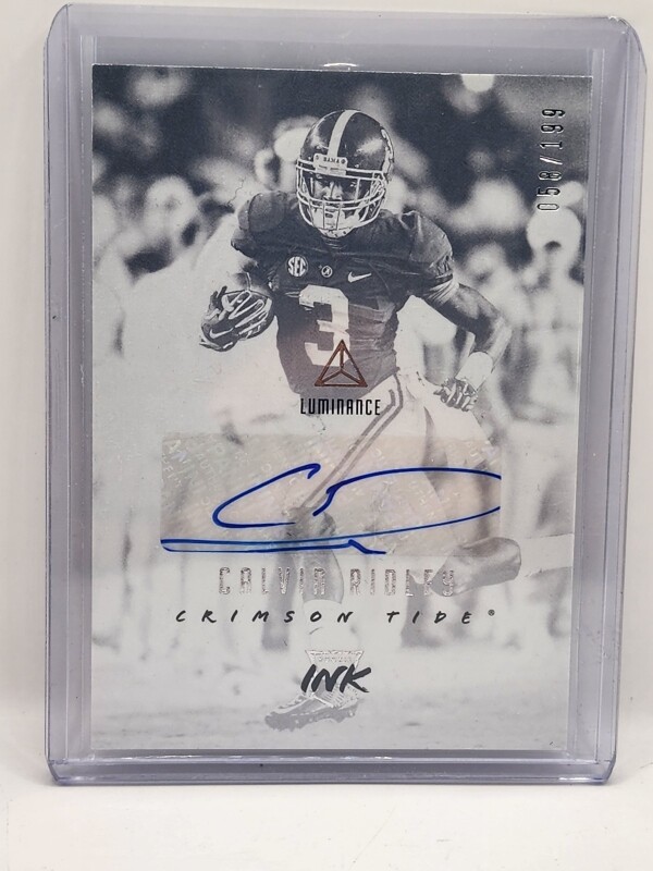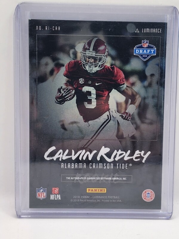 The product is a 2018 Panini Luminance football trading card featuring an autograph from Calvin Ridley, a player who has played for teams like the Jacksonville Jaguars and the Tennessee Titans. This card is a Rookie Ink #RI-CAR /199, making it a limited edition collectible with a print run of only 199. It is made of card stock and is an original release by Panini. The autograph is in the form of a label or sticker and the card is part of the National Football League (NFL) and National Collegiate Athletic Association (NCAA) leagues. This card is a valuable addition to any sports memorabilia collection, especially for fans of football and Calvin Ridley.