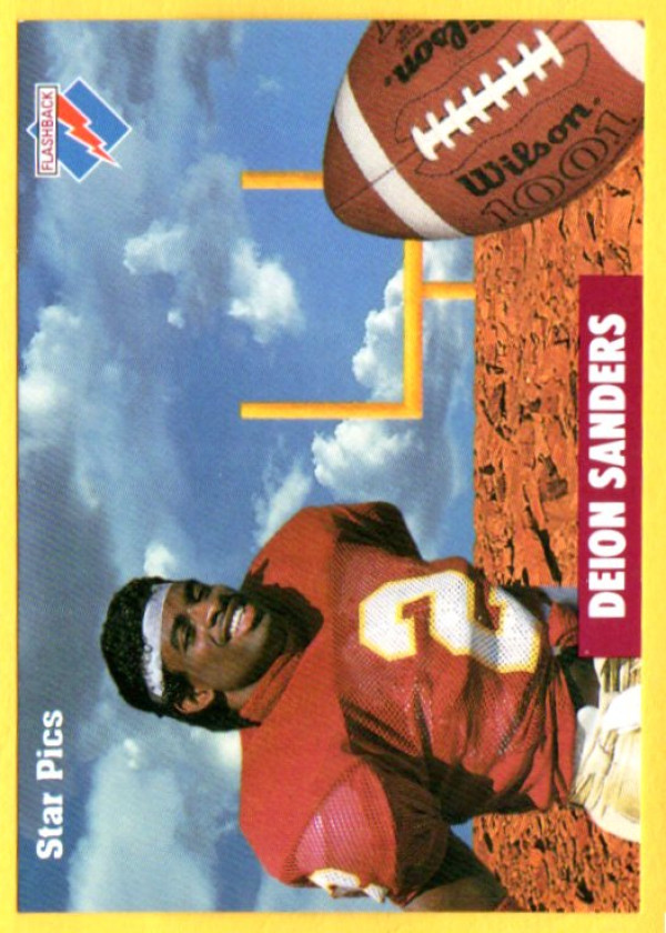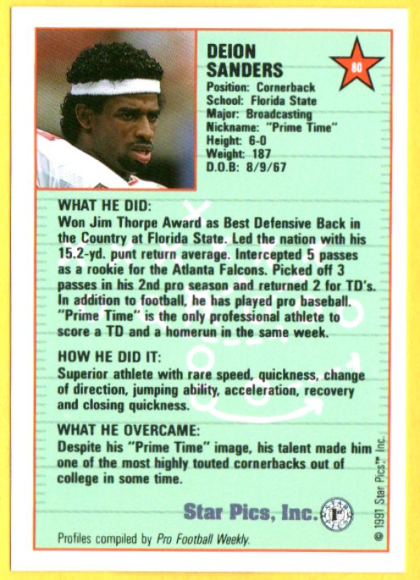 Classic Deion Sanders card from the 1991 Star Pics set. Features “Prime Time” early in his legendary two-sport career.