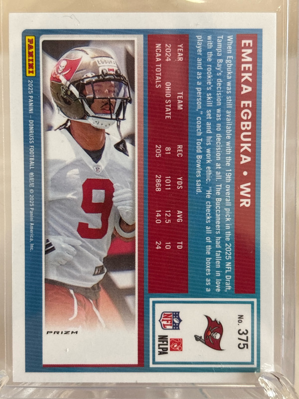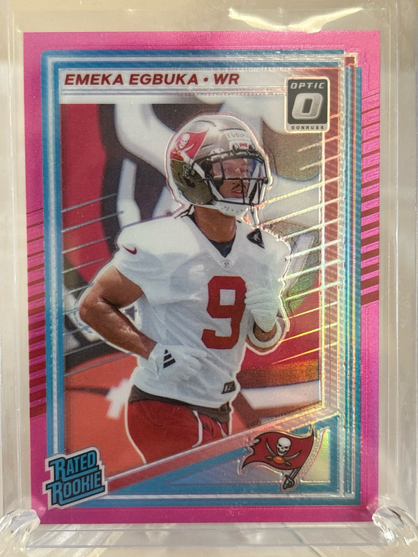 This is a Emeka Egbuka #375 2025 Panini Pink Optic Preview Rated Rookie card in near mint/mint condition.