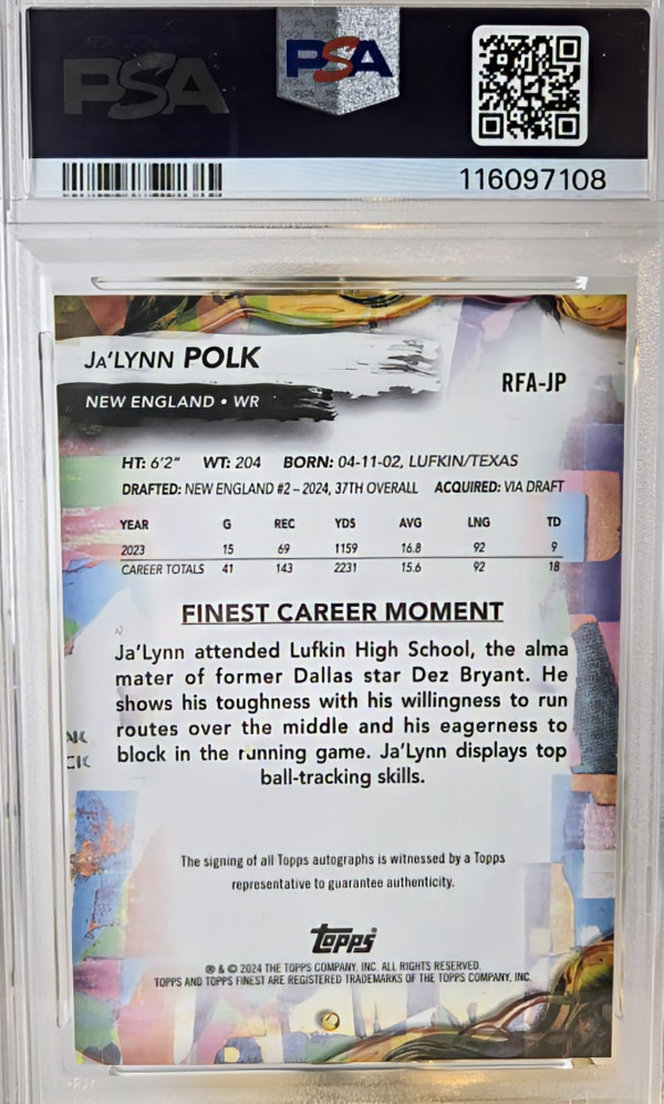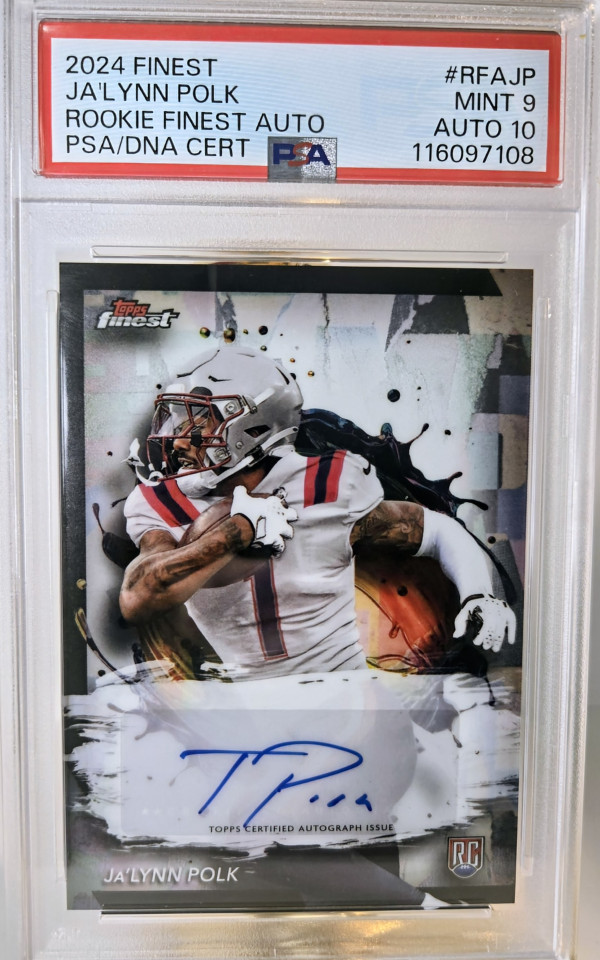 The product is a 2024 Topps Finest football trading card featuring rookie autograph of Ja'Lynn Polk from the New England Patriots. This card is part of the Rookie Finest Autographs insert set and is a refractor parallel variety. With a PSA 9/Auto 10 rating, this card is a valuable collector's item for fans of the National Football League looking to add a unique piece to their trading card collection.