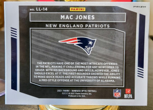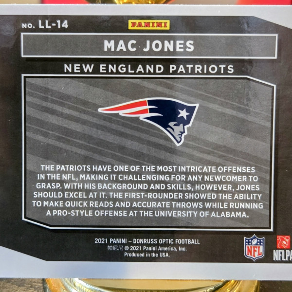 The product is a 2021 Panini Donruss Optic Legendary Logos #LL-14 rookie trading card featuring Mac Jones of the New England Patriots in the National Football League (NFL). This single-insert card is a Holo Prizm parallel variety, near mint or better in condition, and ideal for collectors looking to add a unique and valuable piece to their sports memorabilia collection. With its rookie designation and insert features, this card showcases the rising star Mac Jones in a limited edition design that is sure to be sought after by fans and collectors alike.