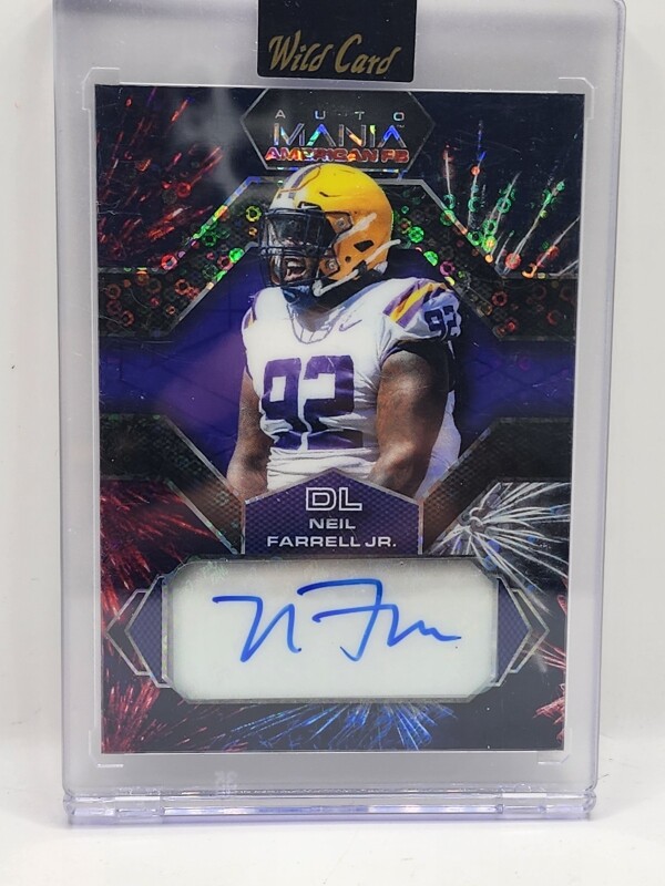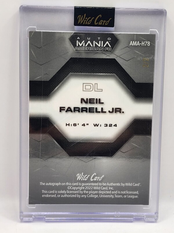 The product is a 2022 Wild Card Auto Mania Retail trading card featuring NFL player Neil Farrell Jr. from the LSU Tigers. The card is autographed by Neil Farrell Jr. in label or sticker format with a limited print run of 2. It is made of card stock and is an original piece, not a reprint. This sports trading card is a must-have for fans of football and collectors of sports memorabilia. The autograph adds value and uniqueness to this card, making it a desirable piece for any collection.