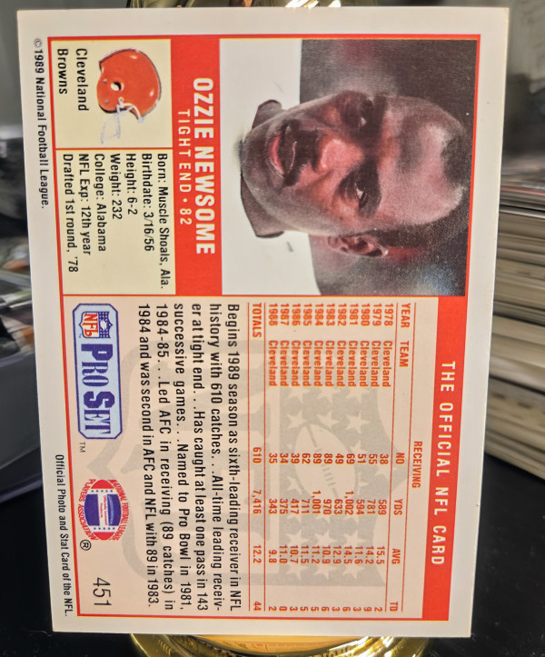 Dive into the legacy of Ozzie Newsome with this cherished 1989 Pro Set Cleveland Browns card #451. This iconic sports trading card captures the essence of the Hall of Famer's contribution to football and is a timeless piece for collectors and fans alike. From the 1989 NFL season, it's a slice of sports history that encapsulates the spirit of the game and the enduring legacy of one of the NFL's notable players.