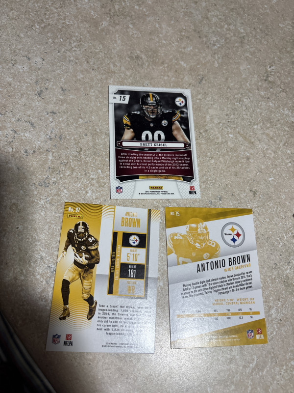 The playoff ticket Antonio Brown is numbered 18/249. The others are inserts and nice cards! Anyone wanna trade?