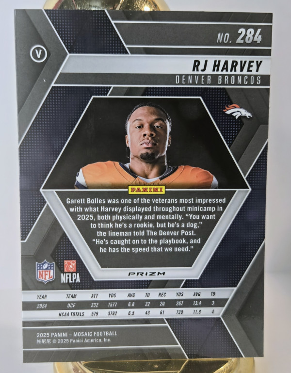 The RJ Harvey 2025 Panini Mosaic Purple Scope Image Variation #284 trading card features the rookie player from the Denver Broncos in the National Football League (NFL). Made of card stock with a thickness of 20 Pt., this original sports trading card is part of the 2025 Panini set. The card showcases the Purple Scope parallel/variety and is authenticated by Panini Authentic, making it a sought-after collectible for football fans and card collectors alike.