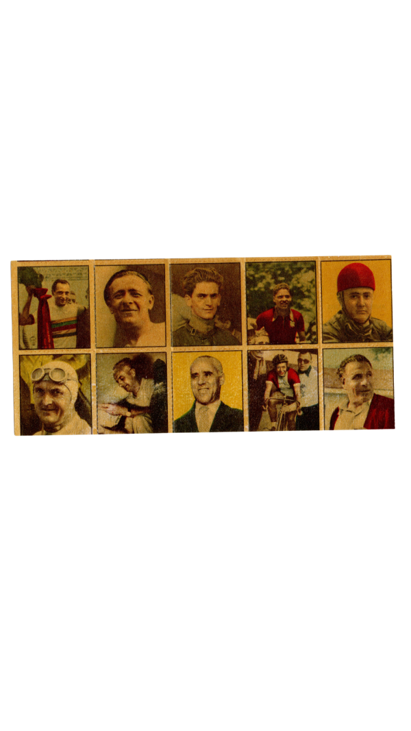 This is an uncut sheet of 10 stamp cards from the 1951 Albosport Didasco set. I've never seen another example that's not separated. It features all racing sports - Auto, Moto & Cycling. The fronts have yellowed, see scans.