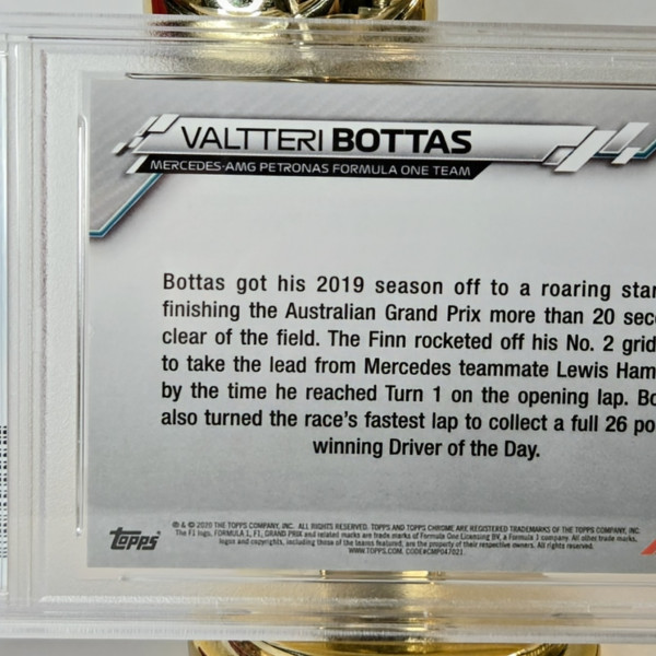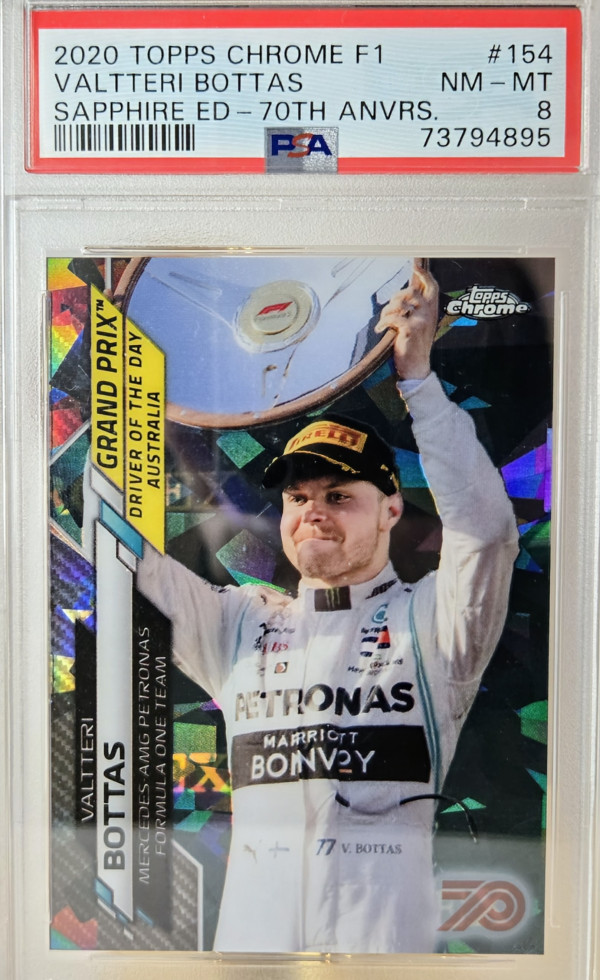 The product is a Valtteri Bottas trading card from the 2020 Topps Chrome Sapphire Edition Formula 1 set. This specific card is part of the 70th Anniversary Refractor parallel variety, with a limited print run of 70. It features a serial number and belongs to the Driver of the Day insert set. The card showcases Bottas as a driver for the Mercedes-AMG Petronas team in the 2020 Formula 1 season. This collectible item is a must-have for fans of auto racing and sports trading cards.