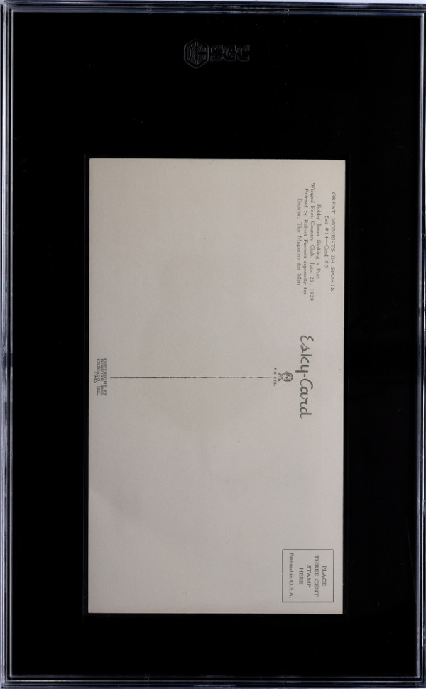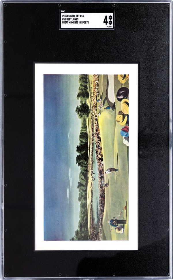 The Esky Cards were sets of numbered jumbo postcards released in packs by Esquire Magazine in 1945. This #5 Bobby Jones card was the only golf card in their "Great Moments in Sports" set #14. This card is extremely rare, there are only 2 graded examples.