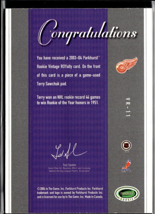 03/04 PARKHURST ROOKIE VINTAGE ROYALTY #VR-11 TERRY SAWCHUK - PRINT RUN 50