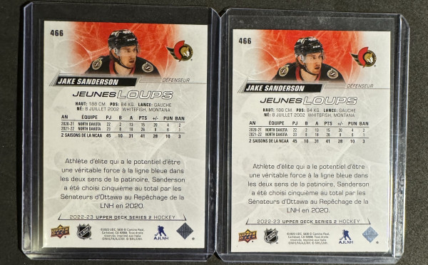 (2) 2022-23 Upper Deck 466 Jake Sanderson Young Guns French