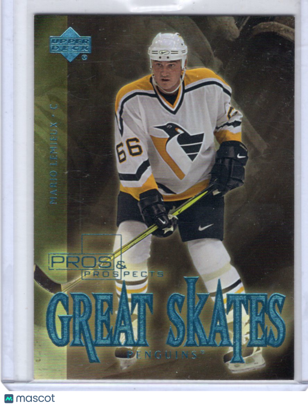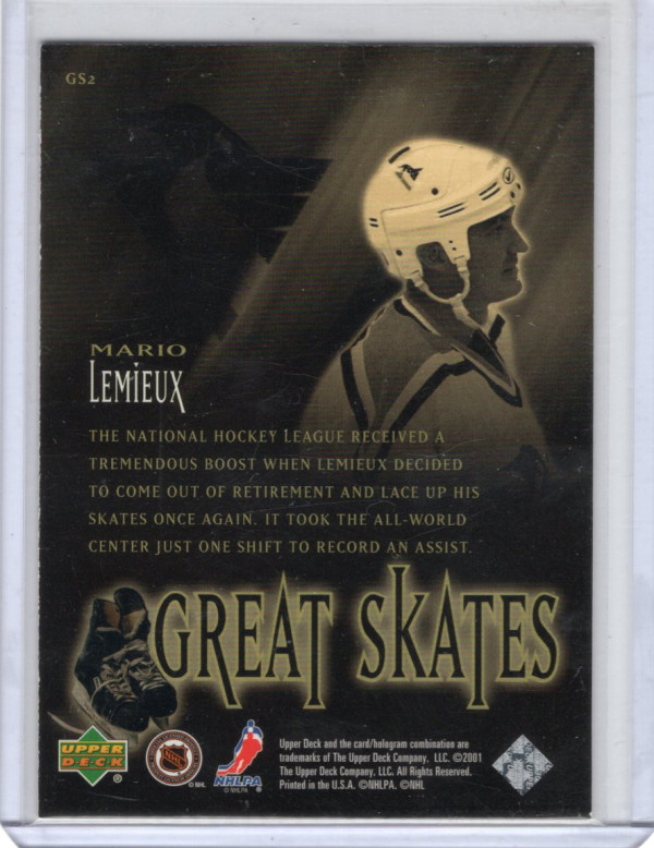 You are purchasing a 2001 Upper Deck Pros & Prospects Great Skates Mario Lemieux #GS2. You will receive the exact item in the photographs. Thank you for looking.