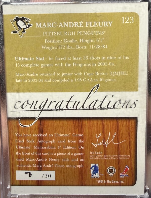2004 In The Game Marc-Andre Fleury Game Used Stick Auto /30