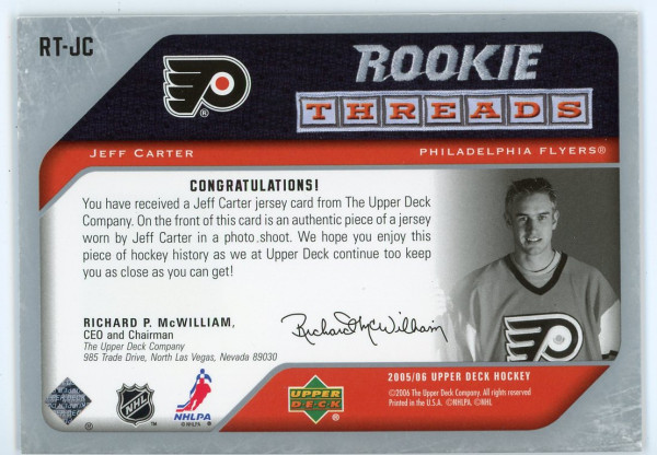 2005-06 Upper Deck Jeff Carter Rookie Threads #RT-JC