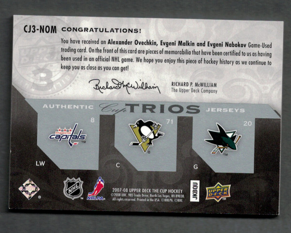 2007-08 Upper Deck The Cup Authentic Cup Trios Jersey Alexander Ovechkin, Evgeni Malkin, Evgeni Nabokov 06/15