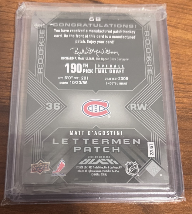 2008-09 Upper Deck UD Black Rookie Lettermen /399 Matt D'Agostini #68 Montreal Canadiens Letter "O"