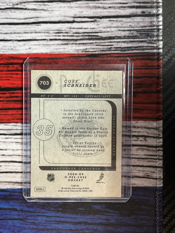 You are purchasing a 2009 2008-09 O-Pee-Chee Marquee Rookies Cory Schneider #703. You will receive the exact item in the photographs. Thank you for looking.