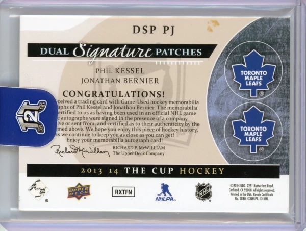 2013-14 The Cup Phil Kessel/Jonathan Bernier Dual Signature Patches Auto /35